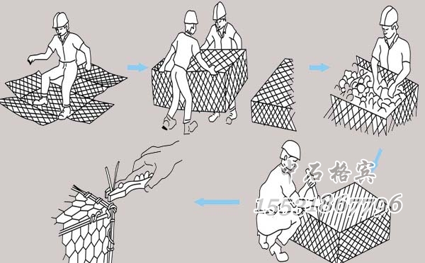 將折疊好的雷諾護墊沿坡面由下往上展開,壓平多余的折痕。將前后面板、底板、隔板立起到一定位置,呈箱體形狀。相鄰網(wǎng)箱組的上下四角以雙股組合絲連接;上下框線或折線,綁扎,并使用螺旋固定絲絞繞收緊聯(lián)結(jié)。由隔板分成若干單元格,為了加強網(wǎng)墊結(jié)構(gòu)的強度,所有的面板邊端均采用直徑更大的鋼絲。將數(shù)件空雷諾護墊放置于平地,將其聯(lián)結(jié)在一起.在有下層網(wǎng)箱組的情況,綁扎上層網(wǎng)箱組間相鄰邊的底線框時,必須將下方網(wǎng)箱組面層框線或網(wǎng)片綁扎在一起,用螺旋固定絲攪擾收緊,以求連成一體。將網(wǎng)蓋向下折,拉到位并與前板、側(cè)板及隔板絞合在一起。用大約長于邊絲1.5倍的綁絲綁扎,所有的面板邊端均采用直徑更大的鋼絲。將相鄰網(wǎng)箱組的上下四角以單股或雙股組合絲連接,雙股間距不大于300mm。上下框線或折線,用綁絲螺旋固定絞繞收緊聯(lián)結(jié)綁扎,邊緣末端的間距最大為100mm,可用鉗子將綁絲固緊。綁扎時需注意保護網(wǎng)絲表層的涂層,不要將其損壞。